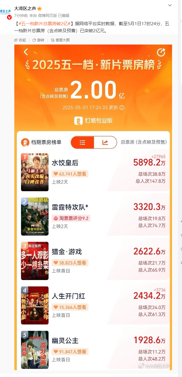 据网络平台实时数据,截至5月1日17时24分,五一档新片总票房(含点映及预售)已突破2亿元。