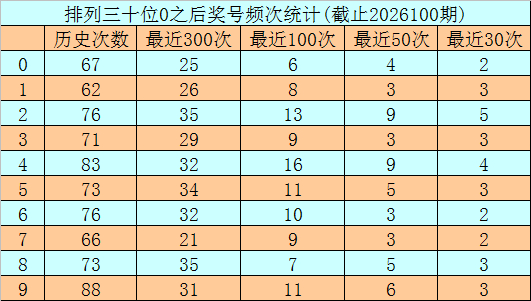 第二位前三次落号0时,下期分别出号:0-2-6,奖号分布在:冷码区段、热码区段、热码区段,本期看好第二位开出热码区段奖号,预计冷码继续轮空。